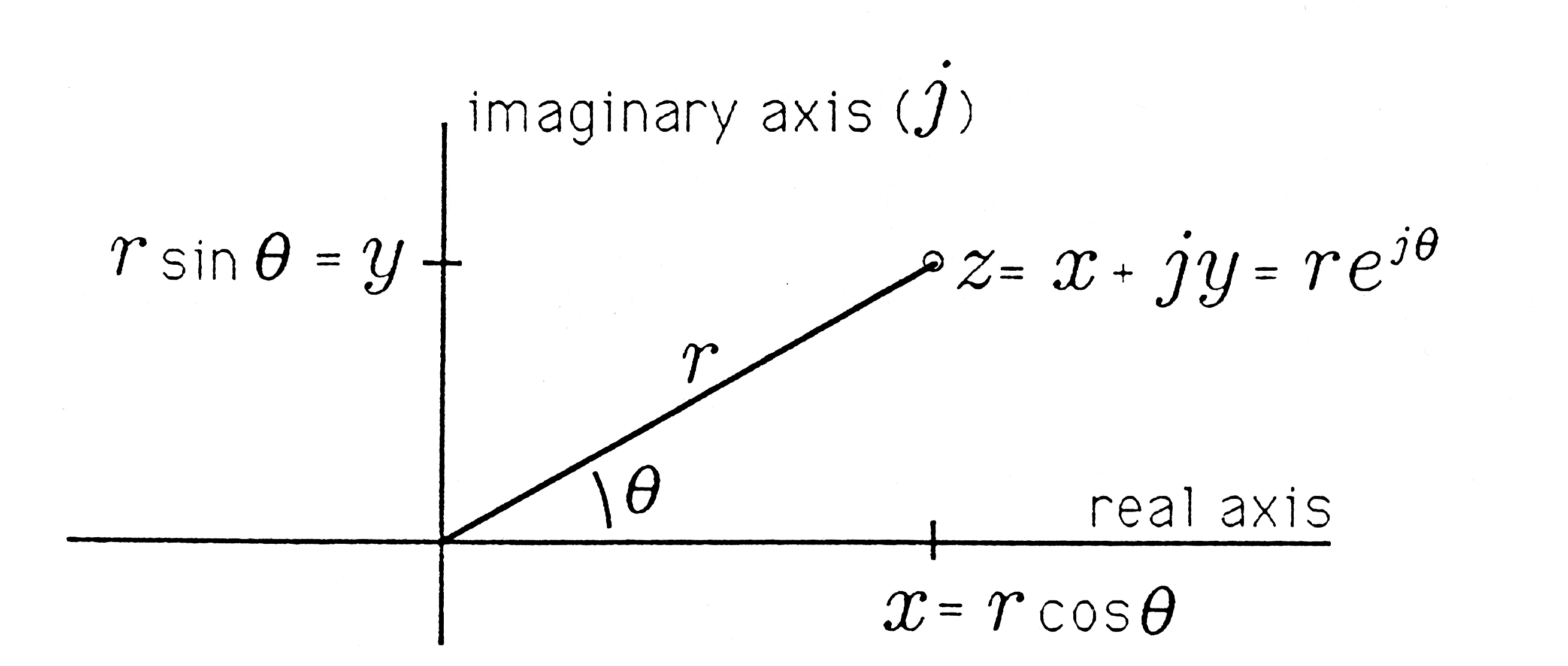 We may plot the complex number z on the plane as in Figure 1.1. We call the horizontal axis the “real axis” and the vertical axis the “imaginary axis.” The plane is called the “complex plane.” The radius and angle of the line to the point z=x+jy are