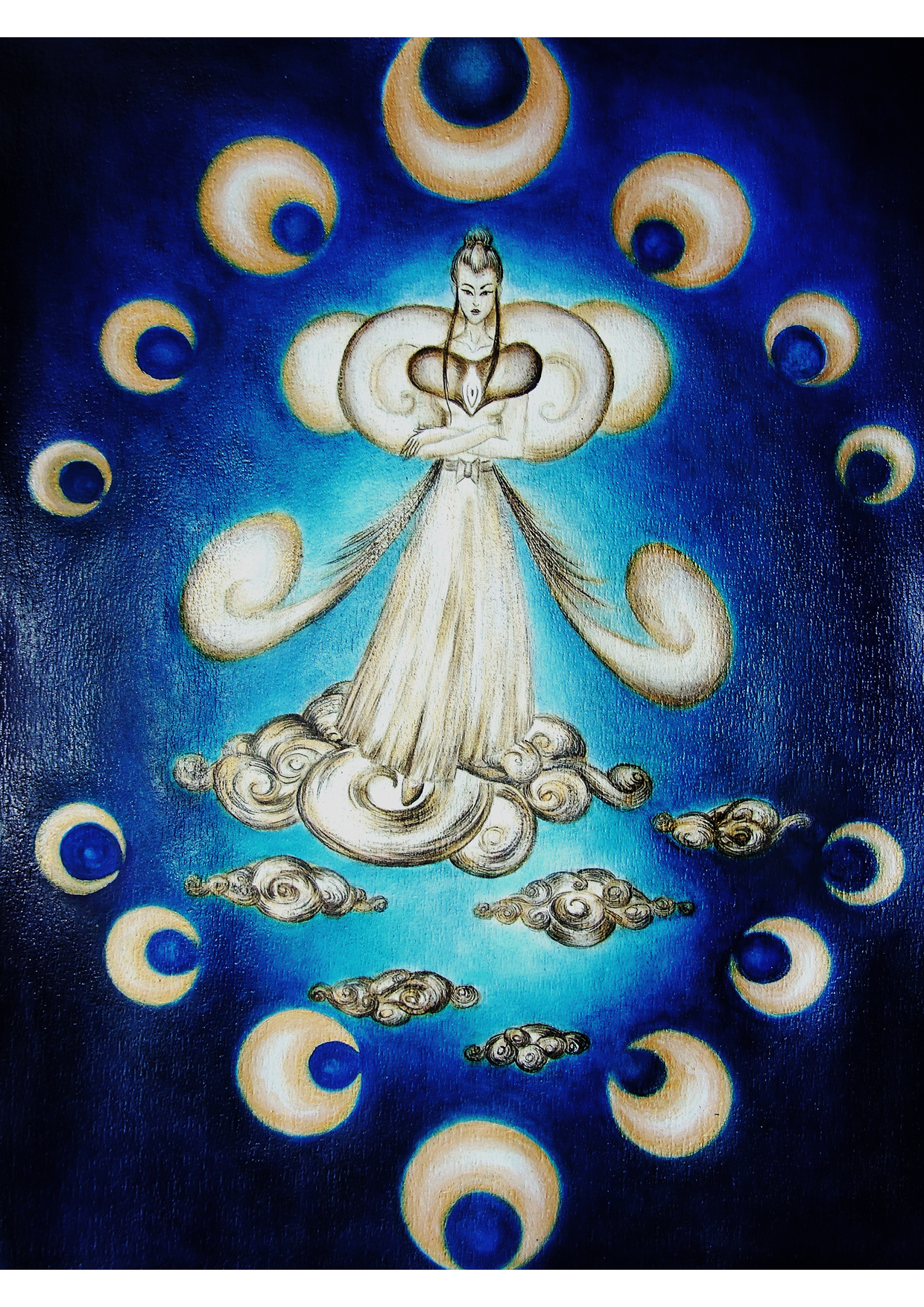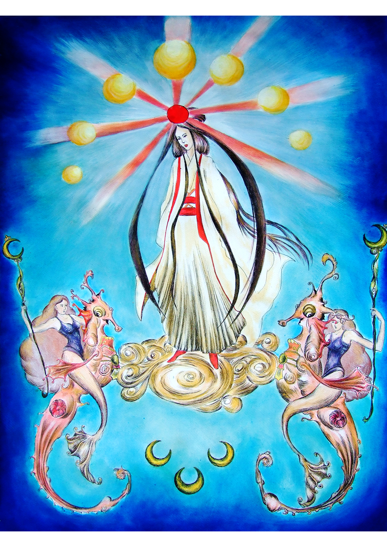 On the top of the world, she waits for her wings of an Angel to come and take her to the meeting. Amaterasu-o-mi-kami was kind to offer one pair of her wings to a special servant of the Kingdom, an honest and much respected guardian; she chose this humble honest mortal for the mission of protecting Ise, her home, but for this, at this special time, she had to give him wings to fly and eyes to see the truth about everyone, the night before - the dangers and the real friends, the enemies and the safety resorts as well as the measures to take. Now, her wings must be brought back to her; the mortal just ended his Journey and knows how to protect the temple and The Kingdom. Whispers of her thoughts let me know about the time to duck into the bushes, the moment when she finally rose and took the deepest and more insatiably-felt breath I’ve ever witnessed. (It made me wish to enjoy the same deep fresh breath, the same way.) A bright light cast upon the peaks, coming from a place only gods might have a clue of the whereabouts. Unified with the Light in herself, the goddess turned into the brightest thing, the brightest Angel. An Angel of light spreading three pairs of sparkling wings of vivid light, unseen by the human eye before, I hope, since I always wanted to tell about something unbelievable I witnessed. I had to watch this scene through my special dark glasses, myself covered by a curtain I made shelter from into the Woods. Don’t ask me what I was doing there. It’s a secret I’ll perhaps tell you about some other time.