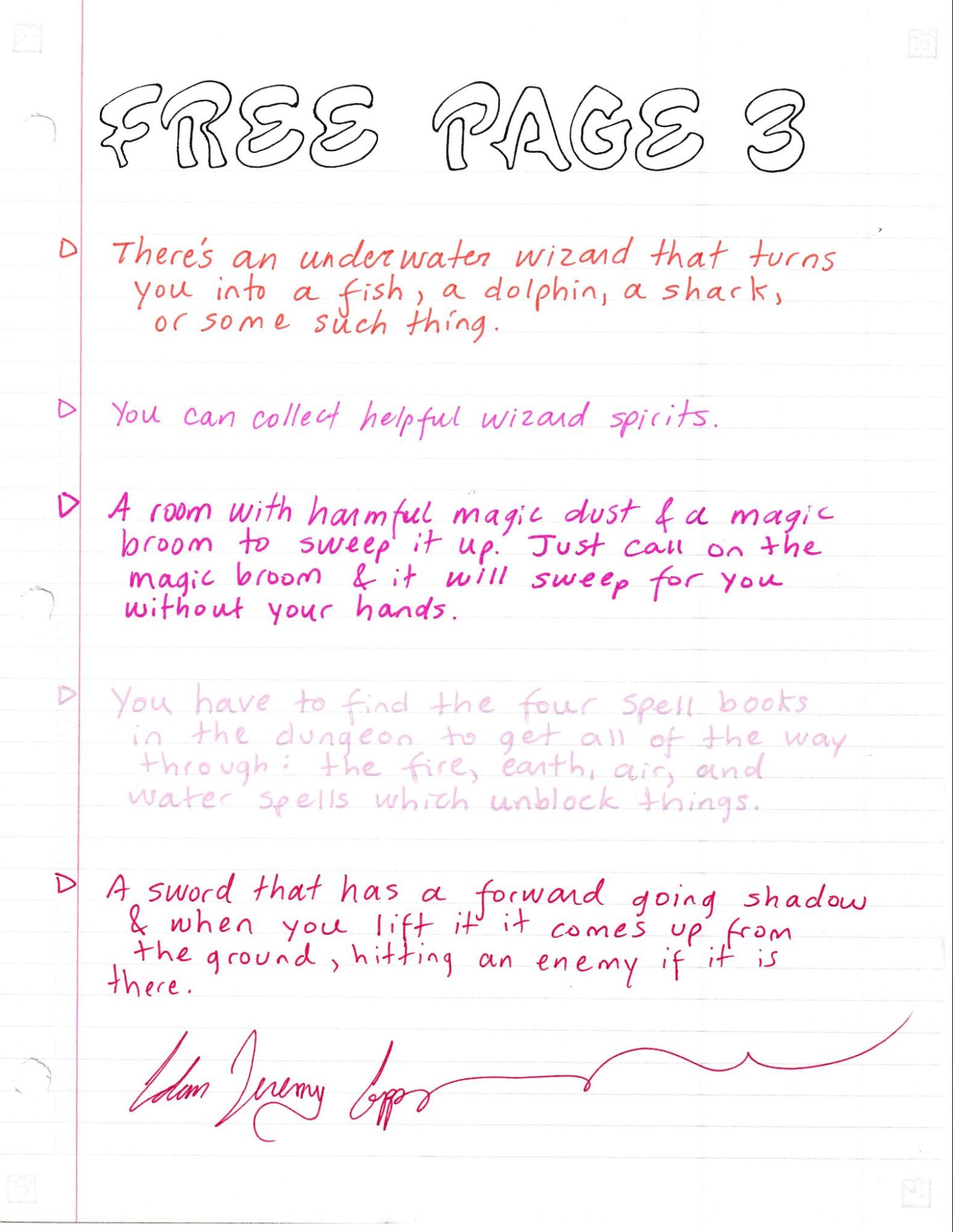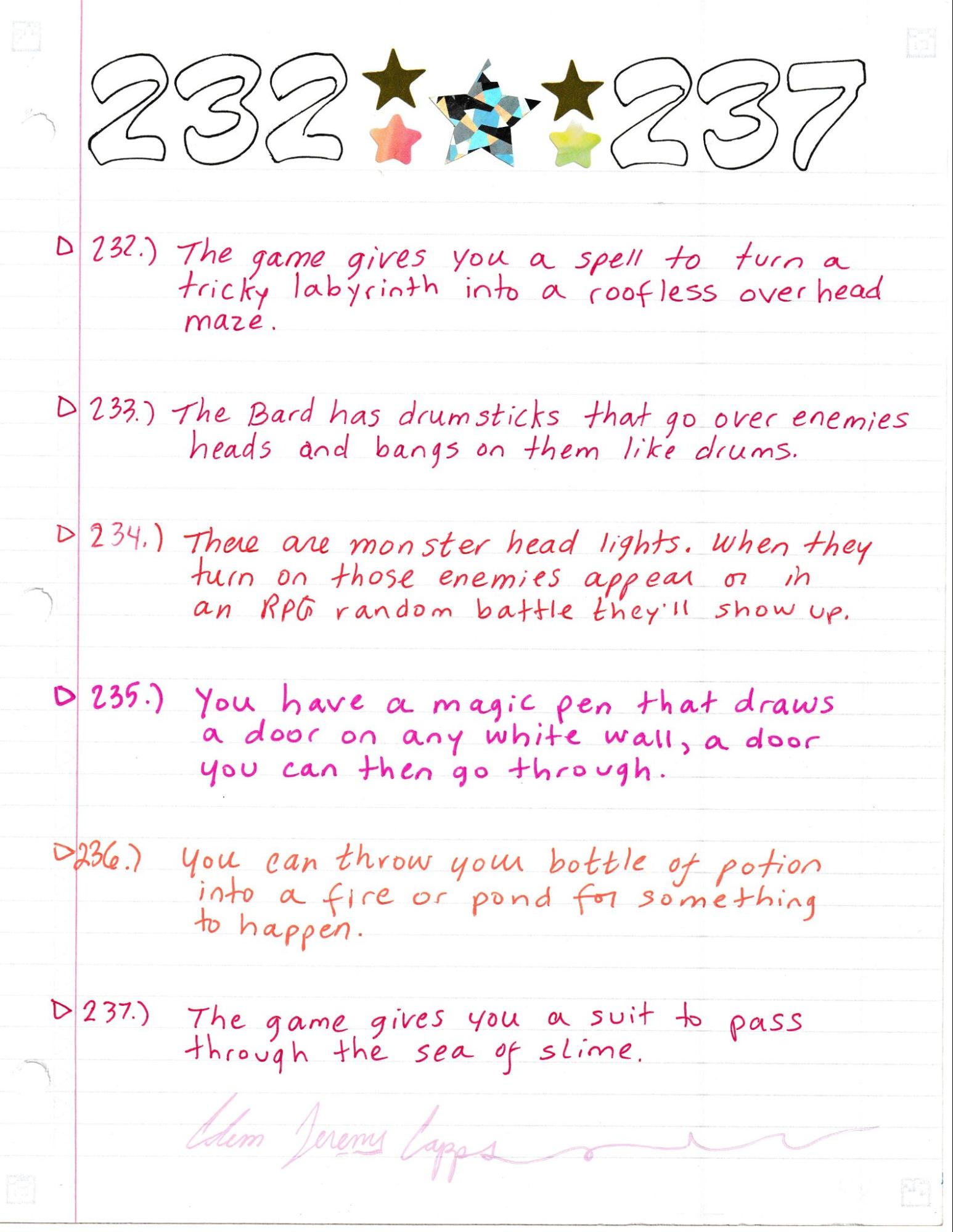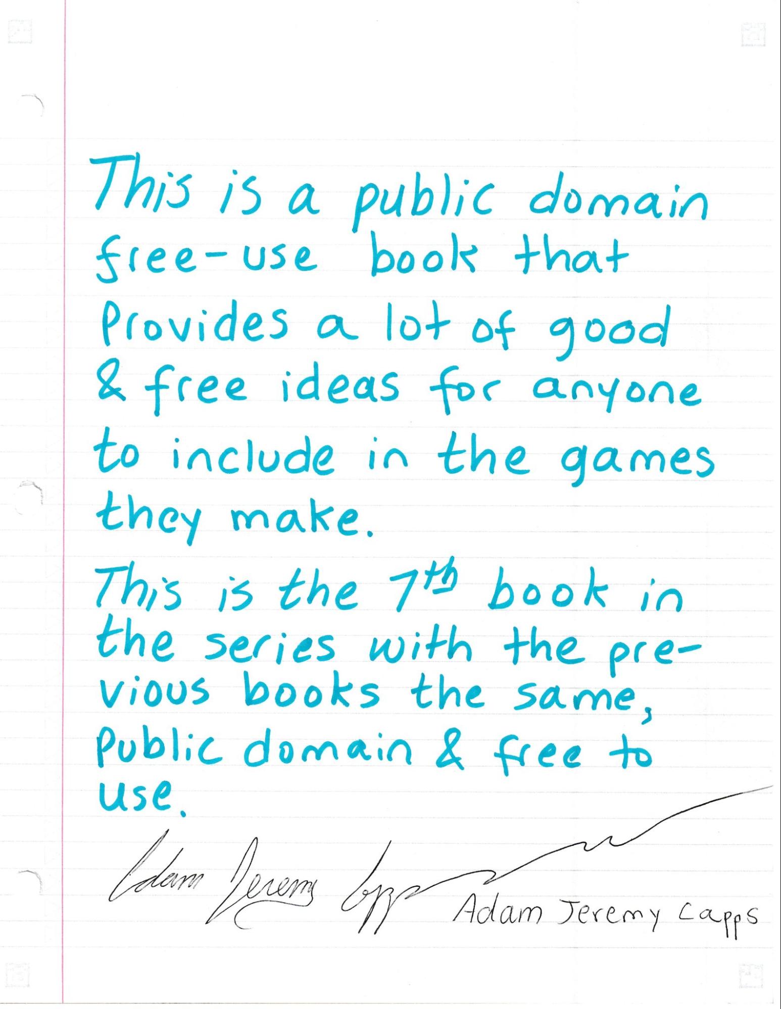 My seventh book of ideas is finished. It’s a little rough around the edges but I consider it a work of art. It is slightly misnumbered but in a positive way (more pages, not some missing numbers.) There’ll be more to come. FInd them free online. I have also written a few other things based on game making, they can be found online under my name: Adam Jeremy Capps.