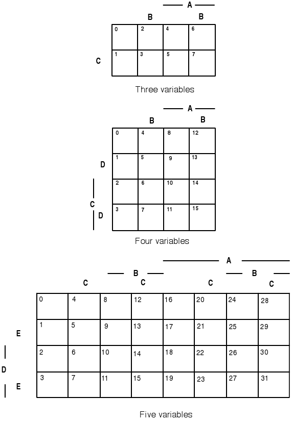 Minterm maps for three, four, or five variables.