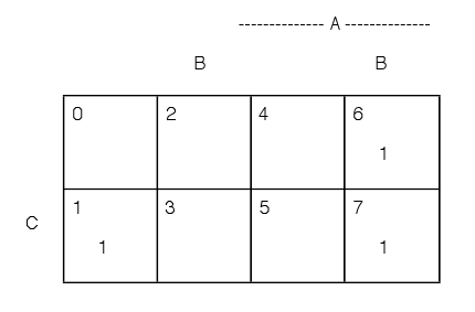 Thus, if ω is in AcBcCcDc, the answers are tabulated as _autogen-svg2png-0033.png. If ω is in ABcCcD, then this is designated _autogen-svg2png-0035.png . With this scheme, the minterm arrangement above becomes