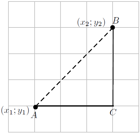 The formula for calculating the distance between two points is derived as follows. The distance between the points A and B is the length of the line AB. According to the Theorem of Pythagoras, the length of AB is given by: