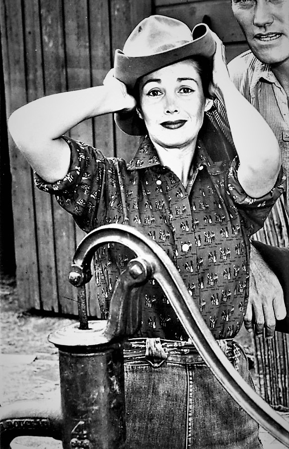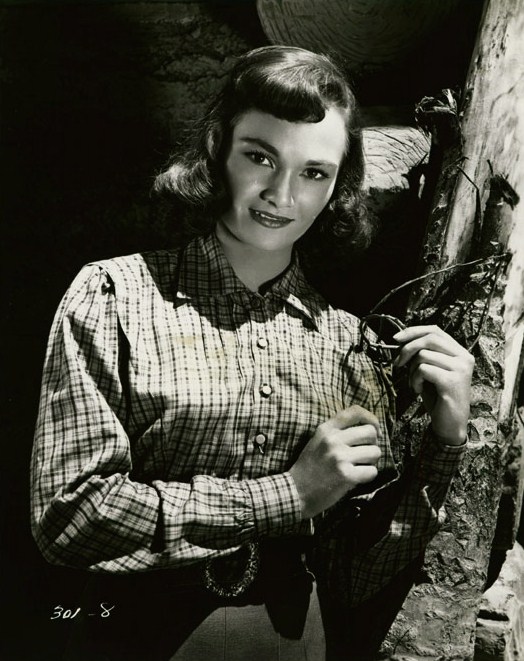 Patricia Medina as Sarita in the Weird West movie about an American cowboy living in Mexico who discovers his missing cattle are being preyed upon by an Allosaurus. Guy Madison as character, Jimmy Ryan develops an interest in fellow rancher Enrique Rios’ fiancee, Sarita.