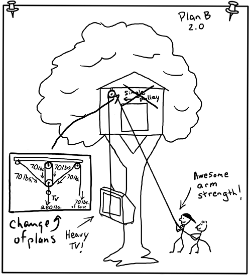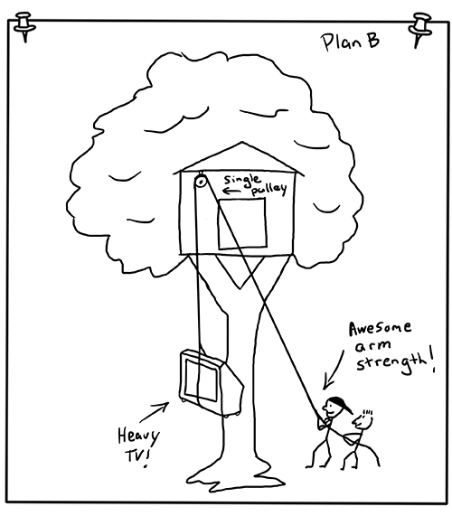 My only question was what were we going to do with a huge projection TV? William gave me a huge smile and pulled his second plan out of his pocket. He quickly ran to his workbench and put it down for me to see. He had drawn a plan with the two of us pulling the giant TV up and into his tree fort using some ropes.