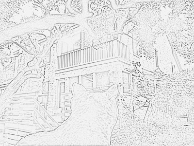 People live in very large holes. Most of the wild creatures I have known lived in small holes, not much bigger than they were. That kept bigger animals from entering their small holes. But people live in big holes, way bigger than they are. And these holes do not have round openings. No, they have sort of square openings. Often they have several openings, which I have noticed as I walked around taking food from their decks and porches. The two people I started watching from the tall grass lived in the Great Hole which seemed nicer than most other people holes. It was not under the ground like wild creatures I have known. Maybe part of it is, but I do not know since I am a wild cat. But this hole seemed nicer to me. I am not sure why. Maybe it just seemed "warmer" to me somehow. Yes, warmer.